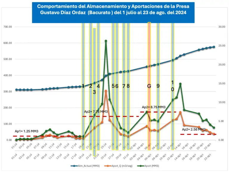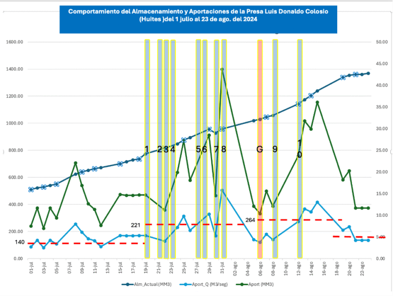 Este gráfico representa el comportamiento del almacenamiento y aportación diaria de la presa Luis Donaldo Colosio y Gustavo Díaz Ordaz con relación a las intervenciones de siembra de nubes realizadas por RainMaker® (líneas verdes con borde amarillo).